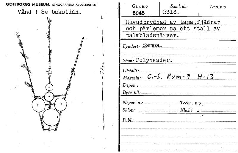• Dep. n:o GOTEBORGS MUSEUM, ETNOGRAFISKA AVDELNINGEN Vänd ! Se baksidan. Huvudprydnad av tapa,fjädrar och pärlemor på ett ställ av palmbladsnäl-ver. Fyndort: Samoa, stam:Polynesier. Utställt: Magasin: ... Visa hela