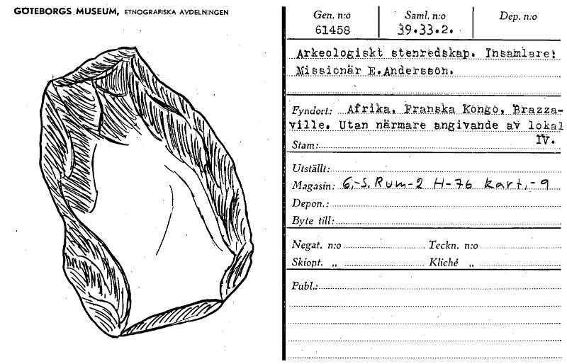 GOTEBORGS.MUSEUM, ETNOGRAFISKA AVDELNINGEN Gen. tvo 61458 Samt. n:o 39.33.2. , Dep. n:o Arkeologiskt stenrodskal). Insainlare! Missionär 2.Andersson. ryndod, Afrika, Pranka Xongo, ntazza- ville. Uta...