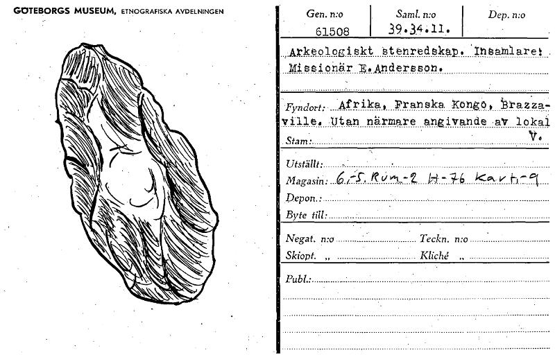 Dep. n:o GOTEBORGS MUSEUM, ETNOGRAFISKA AVDELNINGEN Gen. n:o . Samt. n:o 61508 39.3.4,‘11. Arkeologiskt stenredskap. 'Insamlare: MieSiOnär goAnderasOn. Fyndort: Afrika, Praska Kongo, brazza- ville. U...