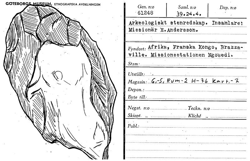 • GOTEBOR , ETNOGRAFISKA AVDELNINGEN Gen. n:o 61248 Samt. n:o 39.2444 • Dep. n:o Arkeologiskt stenredskap. Insamlare: Missionär S.AriderG8on• Fyndort: Af r ilcg' Franska kong°, 131-a-zza- ville. Mission... Visa hela