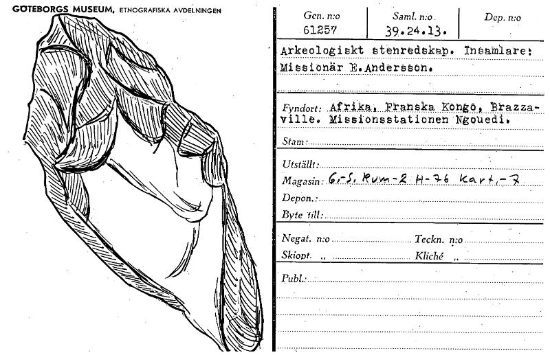 Dep. n:o Gen. wo 61257 Saml.n:o 39.24.13. Insamlare: Arkeologiskt stenredskap. GOTEBORGS MUSEUM, ETNOGRAFISKA AVDELNINGEN Missionär S.Andersson. Fyndort: Afrika, Franska Kongo, 13razza- ville. Missio...
