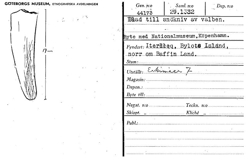 • GOTEBORGS MUSEUM, ETNOGRAFISKA AVDELNINGEN 17— Gen. n:o Saml. n:o " Dep. n:o 44173 2'.9.1W2 Mad till snökniv av valben. yte med Nationalmuseum,Köpenhamn. Fyndort: Iternel, BylotO laIänd, Stam. Utstäl... Visa hela