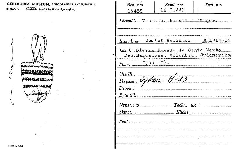 GOTEBORGS MUSEUM, ETNOGRAFISKA AVDELNINGEN ETNOGR. AtIZOL. (Det icke tillämpliga strykas) •k, Elanders, Gbg öen. n :vo 17452 Saml. n:o 1 16.3.441 Dep. n:o i Föremål. Vä..ska ,av bom.ul 1 i Insaml. av: Gus taf Bolinder -Pä.-rgar. År:1914-15 Lokal: ...S.i.e.r...r.:1....N.e.v.ad n d.e S.a.nt a Ma r t a. Dep.Magdalena, Colombia , Sydamerika Stam: Ijca (I). Utställt: Magasin:..11)(401,r.'., ..... Depon.: Byte till: Negat. n:o Teckn. n:o Skiopt. „ KlicU „ . Publ. • [ocr]