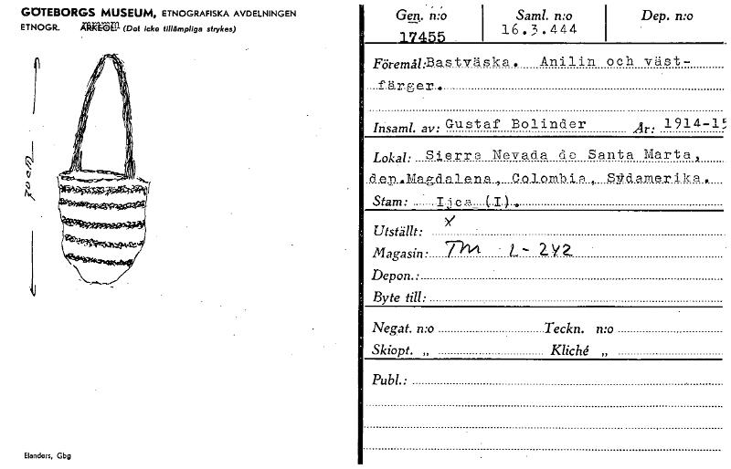 GDTEBORGS MUSEUM, ETNOGRAFISKA AVDELNINGEN ETNOGR. '13111 (Det icke tillämpliga strykas) 6\ Elanders, Gbg Gen; n io 17455 . Saml. n:o i 16.3.444 Dep. n:o i Föremg:Bastväska. Anilin och. väst- ...färgen.. Gustaf Bolinder Irisaml. av: Är: 1914-15 Lokal: Sierra Nevada d e Santa Marta, .d.e.D...Ma.g.d.a.le.n.a..,....Q.a.1.019.1) i. a . Sts-td.amer i k a , Stam: • Ijca_ (I). ›, utställt: . Magasin: PV- L- aY2, Depon.: Byte till: Negat. n:o Teckn. n:o Skiopt. „ KlicU „ Publ. • - [ocr]