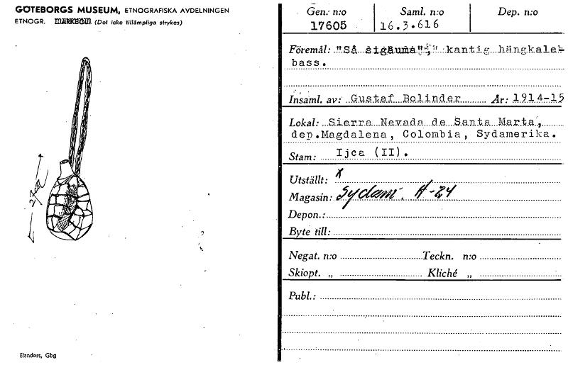 GOTEBORGS MUSEUM, ETNOGRAFISKA AVDELNINGEN ETNOGR. B224~1 (Det icke tillämpliga strykes) Elanders, Gbg .. _ . Gen: n:o 17605 • Saml. n:o 16.3 • 616 Dep. mo Föremål:,"." ..kantig häng,.kale.k, bass. .-, . Insänd. av:- Ck:ustaf Boll/1(1er År: 1914-15 Lokal: Sierra Nevade de Santa Marta', dep.Magdalena, Colombia, Sydamerika. Stam: Ijca (II). Utställt: ir Magasin• fat /14 Depon.: Byte till: Negat. n:o Teckn. n:o Skiopt. „ Kliché „ Publ.: [ocr]