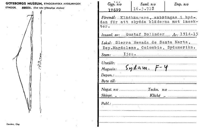 GOTEBORGS MUSEUM, ETNOGRAFISKA AVDELNINGEN ETNOGR. MEM. (Det icke tillämpliga strykas) Elanders, Gbg Gen. 17699 Saml. n:o 16.5.717 Dep. n:o Föreinål: _:..K.Lä.d.h.ä:n;-na2-...e..,....an.b.t.i.ngas....i...hy.d dan för att skydda kläderna mot insek- ter. Insaml. av: Gustaf Bolinder Är: 1914-15 Lokal: $.i.=a Nevada de Santa Marta , Dep.Magda.lena 2 Colombia , Sydamerika. Stam: Ij c a . Utställt: n Magasin: i 4 4 vm 4 Depon.: Byte till: Negat. n:o Teckn. n:o Skiopt. „ Kliché „ Publ.• [ocr]Stäng