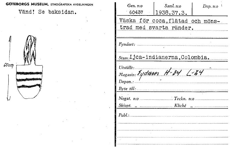 • GOTEBORGS MUSEUM, ETNOGRAFISKA AVDELNINGEN Vänd! Se baksidan. Gen. n:o Samt. n:o Dep. n:o ' 60437 1938.37.3. Väska för coca,flätad och möns- trad med svarta ränder. Fyndort: stamÅjca-indianerna,Colomb... Visa hela