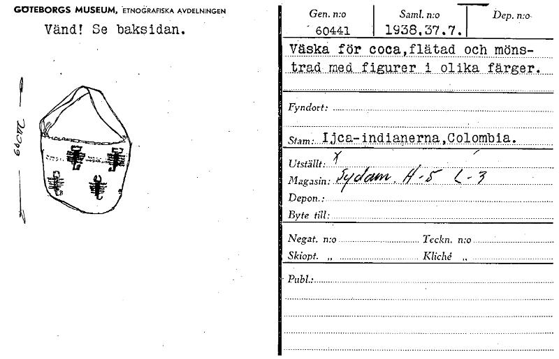 • GOTEBORGS MUSEUM, ETNOGRAFISKA AVDELNINGEN Vänd! Se baksidan. Gen. n:o Saml. n:o Dep. n:o, "60441 1938.37.7. Väska för coca,flätad och möns- trad med figurer i olika färger. Fyndort: stam. Ijca-indian... Visa hela