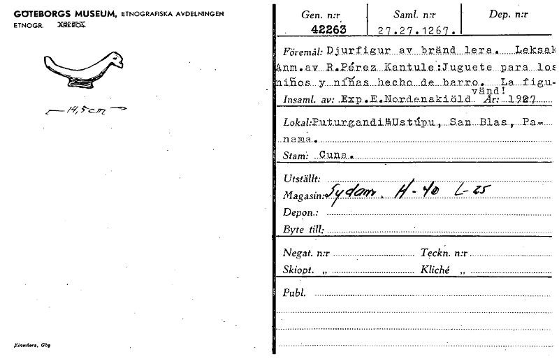 GOTEBORGS MUSEUM, ETNOGRAFISKA AVDELNINGEN ETNOGR. MäkVot. 2- /./ 5fl7 glandera, Gbp Gen. n:r - 42263 Saml. n:r 27.27.1267. Dep. n:r ; Föremg: Dj Urf igUr av bränd lera* Lelua] R ,I>.6.r.e.z...Kantil...