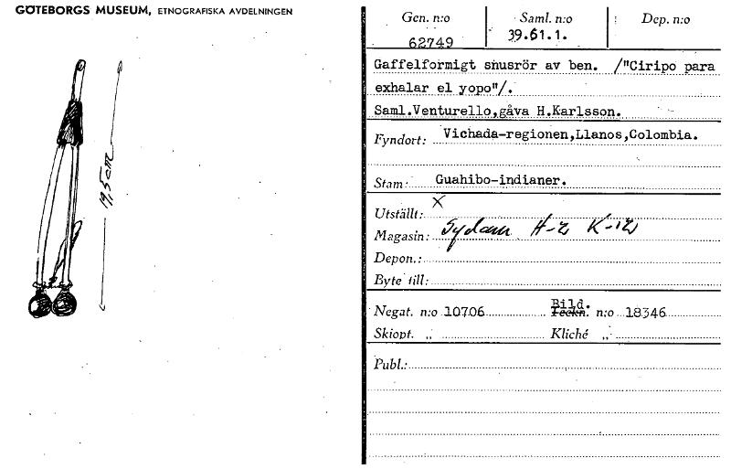 • GOTEBORGS MUSEUM, ETNOGRAFISKA AVDELNINGEN Gen. n:o • Saml. n:o 62749 ' 39.61.1. Gaffelformigt snusrör av ben. Dep. n:o /"Ciripo para exhalar el yopo"/: Saml.Venturello,gåva H.Karlsson. Fyndort: Vic... Visa hela