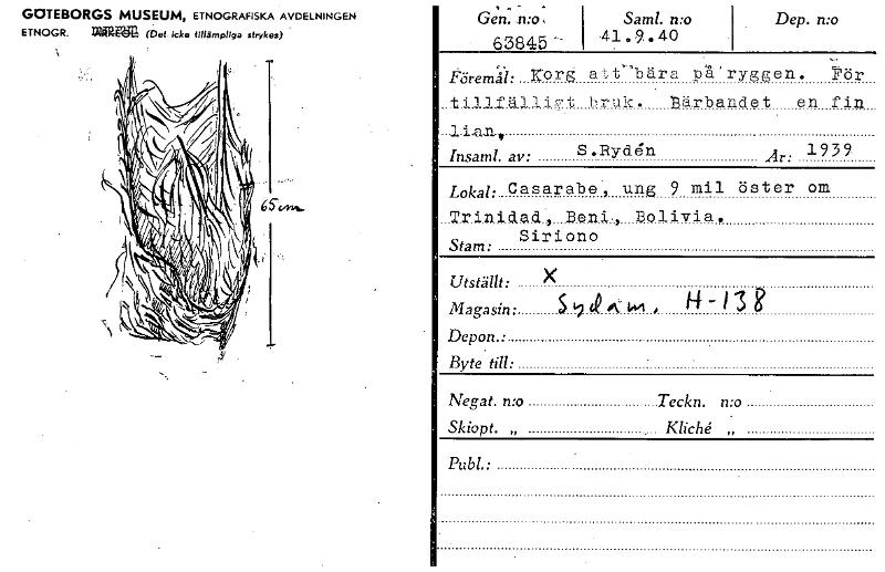 GOTEBORGS MUSEUM, ETNOGRAFISKA AVDELNINGEN ETNOGR. WARM (Del icke fillåmpliga strykes) . Gen. .-n:o, 63845 - Saml. n:o .41.9.40 . Dep. n:o .... töremä: Korg a t,t-bära -oå. ' ryggen. rör _till fal.livt bruk. * närbandet en fin ...1.i.a.n„ Insaml. av: S.Ryclen Är: 19" Lokal: Casarabe , ung 9 mil öster om Triniclaci-, Beni., Bolivia. Siriono Stam: Utställt: X Magasin • 5 19 <4 6 141 • H- 13 g Depon.: Byte• till: Negat. n:o Teckn. n:o Skiopt. „ Klich „ Publ.: , [ocr]