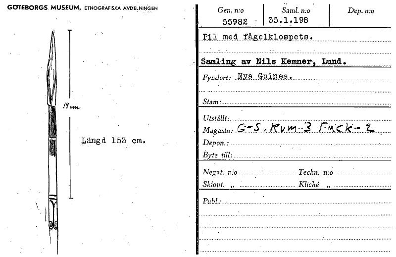 • GOTEBORGS. MUSEUM, ETNOGRAFISKA AVDELNINGEN Gen. n:o Samt. n:o 55982 - 35.1.198 Dep. n:o Pil med. fågeiklospets. Samling av Nils Kemner, Lund. Fyndort: Nya Guinea. Stam • Utställt - Magasin: " 141 -2... Visa hela
