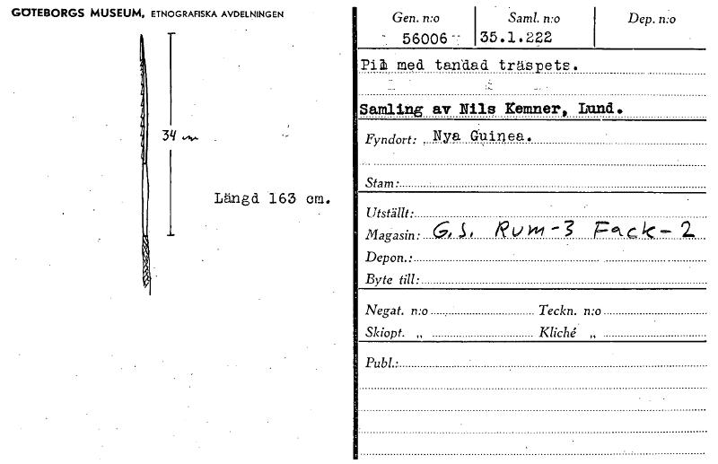 • GÖTEBORGS MUSEUM, ETNOGRAFISKA AVDELNINGEN Gen. n:o Saml. n:o - 56006 55.1.222 Dep. n:o Pil med tandad träspets. Samling av Nils 1emner, Lund. Fyndort: Nya Guinea. Stam: Längd 163 cm. Utställt: Maga... Visa hela