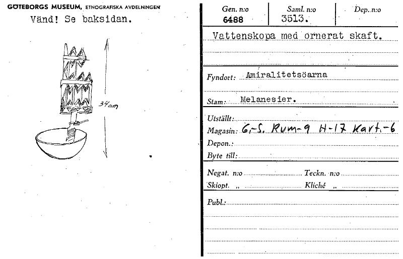 • GOTEBORGS MUSEUM, ETNOGRAFISKA AVDELNINGEN' Vänd! Se baksidan. Gen. mo Samt. n:o 6488 3513. • bep..n:o Vattenskopa med ornerat skaft. Fyndort: Amiral it et sö arna Stam • Melanesier. Utställt • . Mag... Visa hela