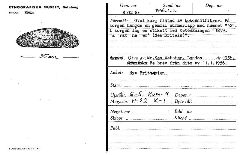 ETNOGRAFISKA MUSEET, Göteborg ETNOGR. ;COOK« Gen. n:r 8502 8' i• Sam!. n:r 1956.1.5. Dep. n:r Föremål: Oval korg flätad av kokosnötfibrer. På korgen hängde en gammal nummerlapp med numret "52". I korgen låg en etikett med beteckningen "1859. 'a rat na em' (New Britain)". itC2MMI., Gåva av:Mr.Ken Webster, London Kömbodinc Se brev från dito av 11.1.1956. Lokal:.. Nya Britailnien Stam: RVI61— Magasin: H- 2 2 K- Depon.: Byte till: Negat. n:r • - Bild n:r Skiopt. „ Kliché „ Publ. ELANDERS. GBG 502. It. 53. [ocr]Stäng