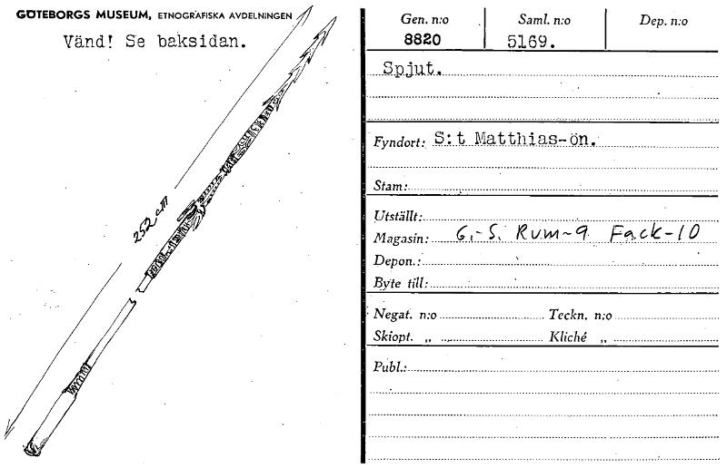 • GOTEBORGS MUSEUM, ETNOGRAFISKA AVDELNINGEN Gen. n:o Saml. n:o Dep. n:o 8820 5169. Spjut, Fyndort: S:t Matthias-ön. Stam • Utställt: Magasin: C i— S, i e V14/I F"ck-10 Depon • Byte till: Negat. n:o T... Visa hela