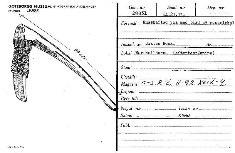 • G by GOTEBORGS MUSEUM, ETNOGRAFISKA AVDELNINGEN E TNOGR. AKKIE•45K Gen. n:r 28851 Sam!. n:r 24.21.11. Dep. n:r I - Föremål: Knäskaftad yxa med blad av musselska: Insaml. av • Sixten Bock. Är Lokal... Visa hela
