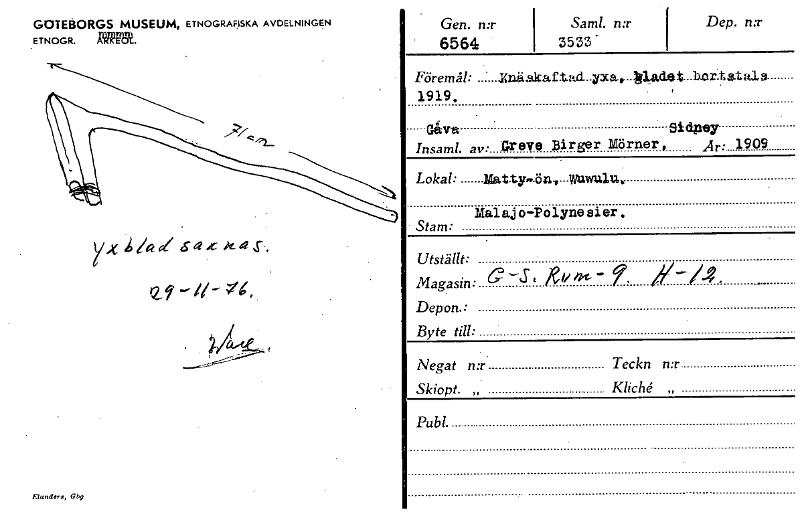 GOTEEIORGS MUSEUM, ETNOGRAFISKA AVDELNINGEN ETNOGR. Nem. yx Å la i 4ra ,r sk •2_9' 7'‘ EMnders, Gbg Gen. n:r 6564 Saml. n:r 3533 ' Dep. n:r Föremål: ' Maii.9.1£ a. f tad yxa...bladet - to r.t st ale 1919. Gåva * Si dpey Insaml. av: :Greve Birger Mörner, , Ar: 1909 Lokal: Mat-ty-ön, -Wriwulu - Mal aj o -P o lyne e i er . Stam: Utställt: i e- Magasin: /fr //-. Depon.: Byte till: Negat n:r Teckn n:r Skiopt. „ Kliché „ Publ. • [ocr]
