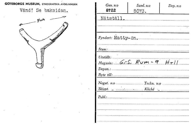 • GOTEBORGS MUSEUM, ETNOGRAFISKA AVDELNINGEN Vänd! Se baksidan. Gen. n:o 8722 Samt. n:o 5073. Dep. n:o 31c-fh Nätställ. Fyndort: katty— . Stam • Utställt: Magasin: Je:T7S e le C.IfrII H. 7- 1 I Depon.:... Visa hela