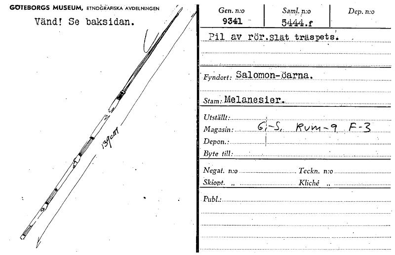 • GOTEBORGS MUSEUM, ETNOGRAFISKA AVDELNINGEN Vänd! Se baksidan. /// Gen. n:o 9341 5444.f 1. Sam!. mo Dep. n:oPil av rör.siät träspets. Salomon-.öarna. Fyndort: Stam • Melanesier Utställt: Magasin: t. 1... Visa hela