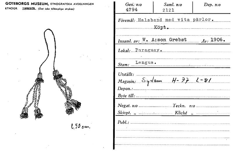• GOTEBORGS MUSEUM, ETNOGRAFISKA AVDELNINGEN ETNOGR. lek. (Det icke tillämpliga strykes) Geri.. n:o 4794 Saml. n:o 2121 Dep. n:o Föremåh..lialab med vita pärlor. Köpt.. Insaml. av: W. A: son Grebst L... Visa hela
