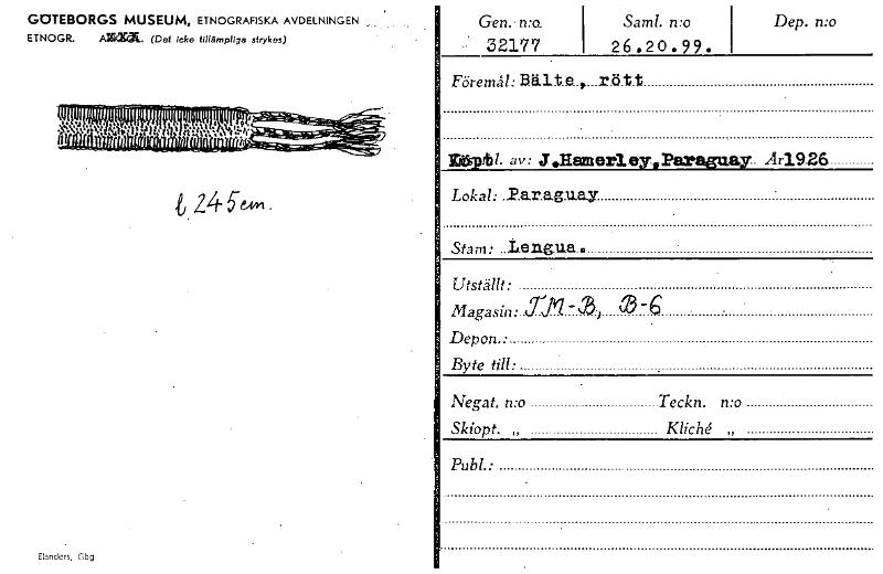 • GOTEBORGS MUSEUM, ETNOGRAFISKA AVDELNINGEN _ ETNOGR. Arradi.. (Det icke tillämpliga strykes) Z46e,'vi. Elanders, Gbg Gen.- mo_ 32177 Saml. n:o 26.20.99. Dep. n:o Föremål: Bälte.. ...rätt 942l. av: J.H... Visa hela