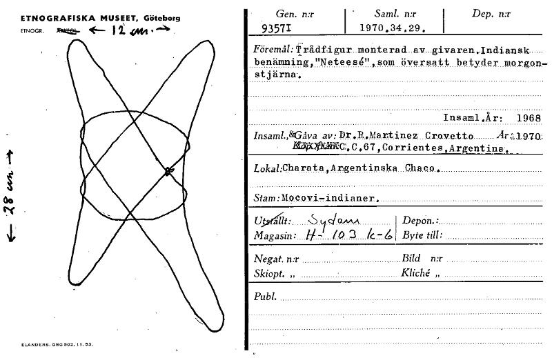 • El-ANDERS. GBG 502. 11. 53. ETNOGRAFISKA MUSEET, Göteborg ETNOGR. .å b. 4— I .0144 • "A, Gen. n:r I Saml. n:r 93571 I 1970.34.29. Dep. n:r Föremål: Trådfigur monterad .av givaren.•Indiansk benämning, ... Visa hela