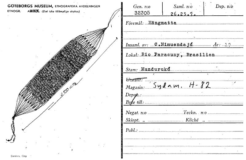 Elanders, Gbg ' Gen. n:o 32305 Sam!. n:o 26.25.1. ' • Dep. n:b Föremål: ...11.ängma.t.t.a. Insaml. av: .... C...N.imue.ndatti.  År: 2, Lokal:...111.o....P.a,raauny.:,...Br.a.silie.n , Stam: ..Munduruk...