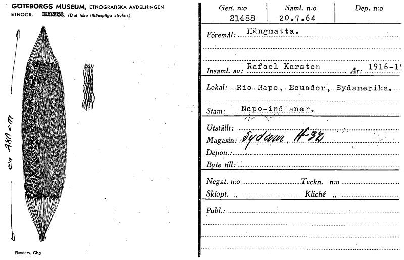 GOTEBORGS MUSEUM, ETNOGRAFISKA AVDELNINGEN ETNOGR. (Det icke tillämpliga strykas) ;III 1 7'''',,,9 kli1,,,,':,,.,.,■\,H, pipilf4,1000, vil,,,, "ii■ , Wor}!,'\\■49,,' ■NI;','11',',■1 361 9011tKW ,I1 ■,4,,, f9 1■1'159,11',,, to "#MNAYM43.[ 1 i, fil 14;P,mti.A '1440,Amo* ‘41 03 04 111 , Elanders, Gbg Gen: n:o 21488 Sam!. n:o 20.7.64 Dep. n:o Hängmatta. Föremål: Rafael Karsten Insaml. av: 1916-1! År: Lokal: ....R.i.o...Napo..,....E.e-u-ad.o. Stam: Napo-indianer. Sycl,amerika-. Utstälit: Magasin• "fri. Of"(•, , Depon.: • Byte till: . . Negat. n:o Teckn. Skiopt. „ Kliché n:o Publ.: [ocr]