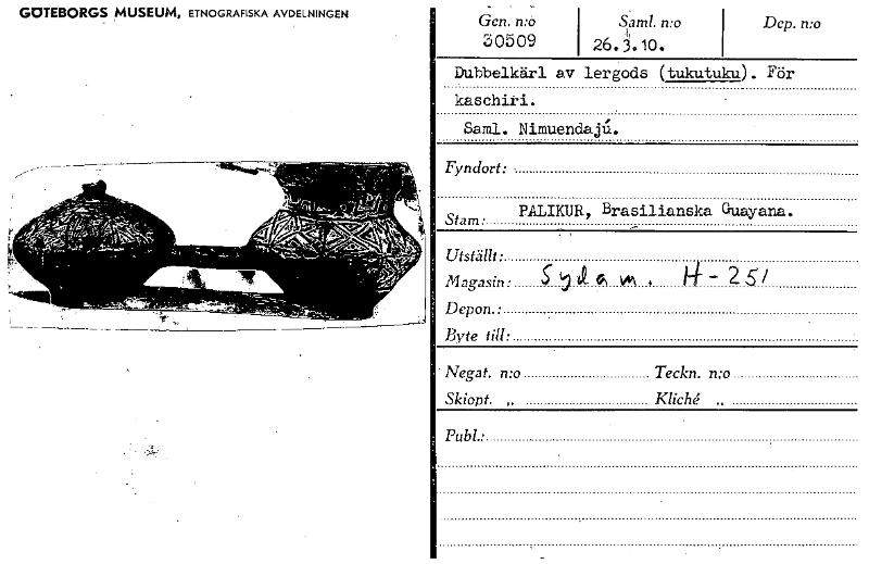 • Gen. n:ö 30509 Dcp. n:o Saml. n:o 26.3.10. GOTEBORGS MUSEUM, ETNOGRAFISKA AVDELNINGEN Dubbelkärl av lergods (tukutuku). För kaschiri. Sami. Nimuendajll. Fyndort: Stam • PALIKUR, Brasilianska Guayana. ... Visa hela