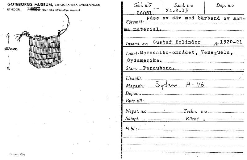.GÖTEBORGS MUSEUM, ETNOGRAFISKA AVDELNINGEN ETNOGR. . (Det icke tillämpliga strykas) Elandels, Cbg Gen. n::5- 26n51:- Saml. n:o 24,2.1, Dep. n:o påse av Säv med bärband av sam Föremål: ma...material. Insaml. av: Gustaf. Bolinder Ar2.920-21 Lokal: Maracaibo-områdt., Venezuela, Sydamerika, Stam: ....P.araubAno . Utställt: Magasin: 5 cleuvtA i-) - //6 Depon.: • Byte till: Negat. mo Teckn. mo Skiopt. „ Kliché„ Publ ., 60c2r) [ocr]