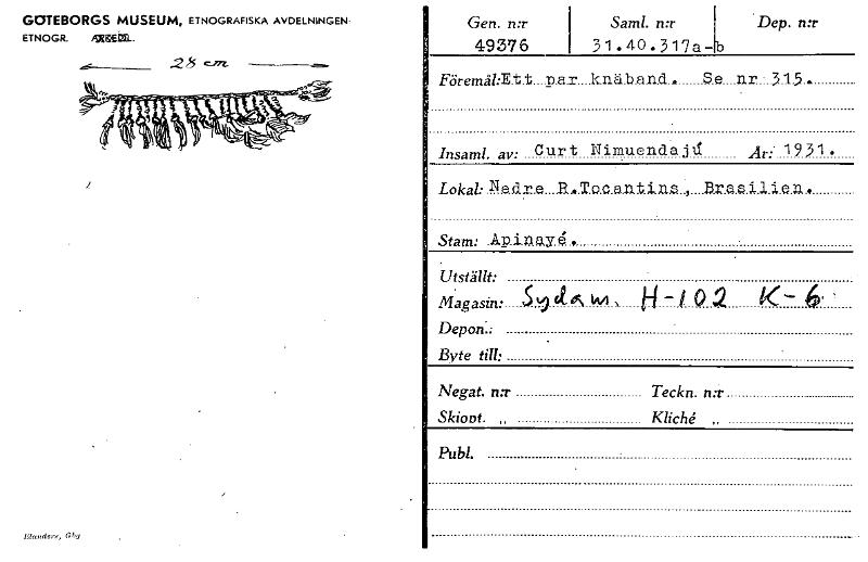 GOTEBORGS MUSEUM, ETNOGRAFISKA AVDELNINGEN ETNOGR. agela. em. Effinders,699 Gen. n:r 49376 Sam!. n:r 31.40.317a-b • Dep. n:r FöremåliEt.t....n.a.r....k.nä.b.an.d.. .e. ...nr • 31.5.. • Insaml. av: Curt Nimuendayd År: 191. Loka/. Nedre R.Tocantins , Brasilien. Stam: .Ap.,i nay . Utställt: Magasin: S 9 eN wi .. — i Q 2 Depon:- • Byte till: Negat. n:r Teckn. n:r , Skiont. , Kliché , Publ. [ocr]