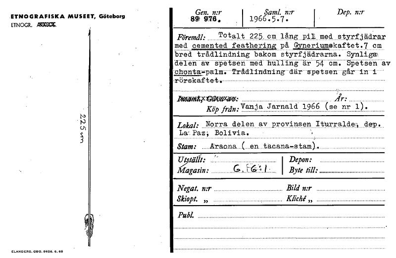 ELANDERS. GBG. 8628. 8. 66 Gen. n:r Saml. n:r 89? 978. 11966.5.7. Dep. n:r I Föremål: Totalt 225, cm med cemented feathering. lång pil med styrfjädrar på Gyneriumakaftet .7 cm styrfjädrarna. Synliga är 54 cm. Spetsen 2 där spetsen går in i ' 0 Ar: 1966 (se nr 1) . bred trådlindning bakom delen av spetsen med hulling chonta,,palm. Trådbindning" rörskaftet. WiftPgaffiCar : Köp från: Vanja Jarnald Lokal: Norra delen av provinsen Iturralder; dn. La-, Paz ; Bolivia. Stam: Arao.na ( en tacana,-stam.). Utställt: '' Magasin: , 1 Depon: Byte till: Negat. n:r Bild n:r Skiopt. „ Kliehi „ Publ. ETNOGRAFISKA MUSEET, Göteborg ETNOGR. ~CC. av [ocr]Stäng