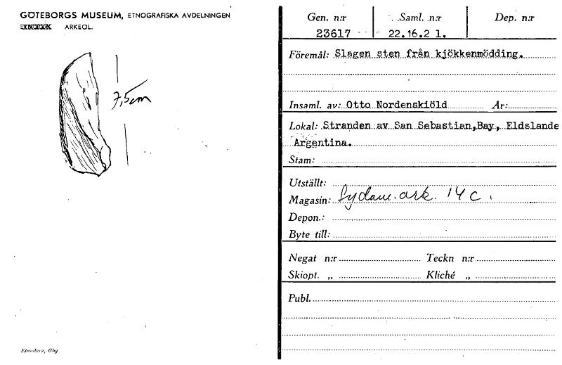 GOTEBORGS MUSEUM, ETNOGRAFISKA AVDELNINGEN C51210:3‘ ARKEOL. Gby Gen. n:r 23617 - -. ,Saml. .n:r - 22.16.2 1. Dep. n:r Föremål: Slagen sten från kjökkerunödcli,ng., Insaml. av:...Otto...Nordenzkiöld ...