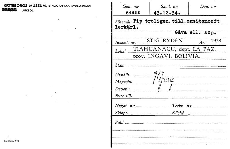 GOTEBORGS MUSEUM, ETNOGRAFISKA AVDELNINGEN 1:1~41 ARKEOL. Gen. n:r 64922 Sam!. n:r 43.12.34. Dep. n:r Föremål: Pip- troligen:- till ornitomorft lerkärl. Gåva ell. köp. STIG RYD1N 1938 Insaml. av: Ar: Lokal: TIAHUANACU, dept. LA PAZ, prov. INGAV!, BOLIVIA. Stam: Utställt: Magasin: Depon.: Byte till: 9P/ (i)111,07, Negat n:r Teckn n:r Skiopt. „ Kliché„ Publ. Elanders, Obs, [ocr]