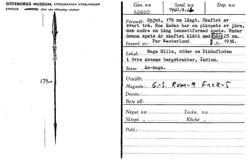 Gen'.-n:o 63680- - Saitil. ri:o 1940.9.46. • Dep. n:o - Föremål: 814", 179 .cm långt." Skaftet svart. trä Ena ändan har en pikspets --den—andra-eni-Iång-lansettformad.-s•ets•.---Under--- _..clenna...spete...ä.r...okaftet..klätt..gleel Per -Westerlu.nd Insaml. av: av av järn, IM 25..c.a. - - ,4r: 1938. Naga Hills, söder om Dikhufloden Lokal: i övre Assams bergstrakter, Indien. Stam: Ao—naga. Utställt: - S le vtAi 9 Fl. c k - Magasin • 6. i , Depon.: Byte till: Negat. n:o Teckn. n:o Skiopt. „ Klichd. ,, Publ.: GOTEBORGS MUSEUM, ETNOGRAFISKA AVDELNINGEN ETNOGR. *~FPFEETE! (Det icke tillämpliga strykes) 1791..Th [ocr]