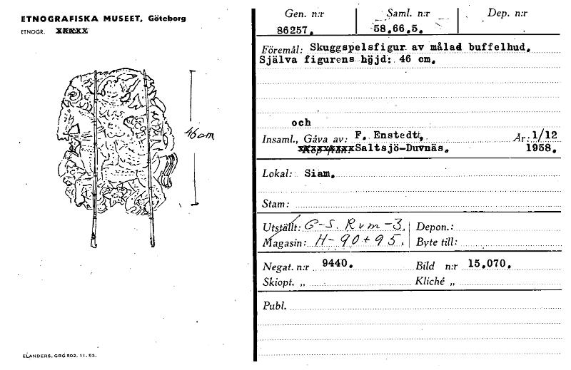 ETNOGRAFISKA MUSEET, Göteborg ETNOGR. WRIOCX .Jr Gen. n:r Saml. n:r I Dep. n:r -'5-8-4,66 .6. I 86257, Skuggspelsfigur av målad buffelhud, Föremål: Själva figurens höjd: 46 cm, och Enste ött, Insaml.,...