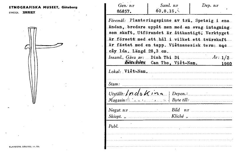 ETNOGRAFISKA MUSEET, Göteborg ETNOGR. =Edla ELANDERS. GOD 502. 11.53. Gen.- n:r 86857. Sam!. n:r .60,8.15, Dep. n:r Föremål:. Plante rings.pinne av....trk....S.petsig..1 ..ena... ..ändan.,...bredare. uppåt_men..med.en.. svag. intagning- som skaft, Utf ö randet ..är...åttkantigt; _Verktyget... ..är..färsett_med...ett ..hål .. i ..vilket-ett-tvärskaft är f.ö. ... tat med. .en tapp .. Vietnamesisk ..term:...nqc cåy 14a. Längd 28,3 cm. Insaml., Gåva av: Dinh .T.hi..Di Ar :..1/2.-- ~xiFifilitt Can Tho , Vi t—Nam. 1960 Lokal: Vigt--Nan. Stam: Utställt: i r. hdh k- i..-1 c., Y . Depon.: Magasin:17 - — . Byte till: Negat. n:r Bild n:r Skiopt. „ Kliché Publ. • [ocr]