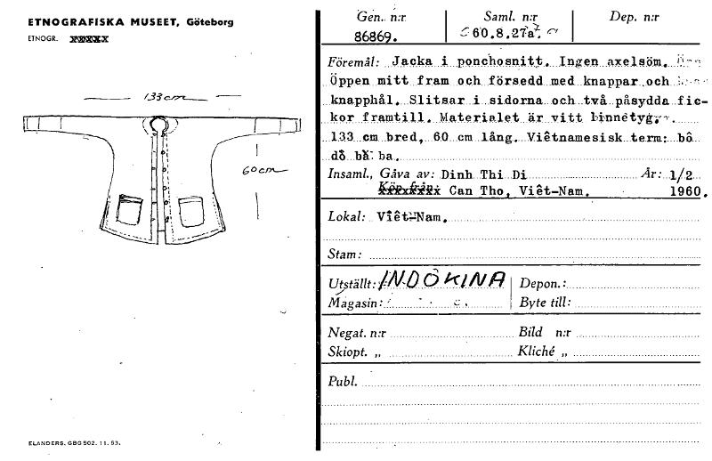 ETNOGRAFISKA MUSEET, Göteborg ETNOGR. XeMEXX ELANDERS. GBG 502. 11. 53. Gen. n:r 86869. Saml. n:r i r: 60 .8 .2"(j. cY I I Dep. n:r Föremål: Jacka i ponchosnitt. Ingen axelsöm. ;-;—, Öppen mitt fram och försedd med knappar ,och :.' -: knapphål. Slitsar i sidorna och två påsydda fic kor framtill. Materialet är vitt linnötygi-i. 133 cm bred, 60 cm lång. Viatnamesisk term: 136 dB bii:ba. Insaml., Gåva av: Dinh Thi Di Ar: 1/2 192:drÅlä Can Tho, Viet—Nam. 1960 Lokal: VigtPNam. Stam: Utställt:PIO C3 kiNA ....- Magasin: ' - . c , Depon.: Byte till: Negat. n:r Bild n:r Skiopt. „ Kliche' „ Publ. . [ocr]