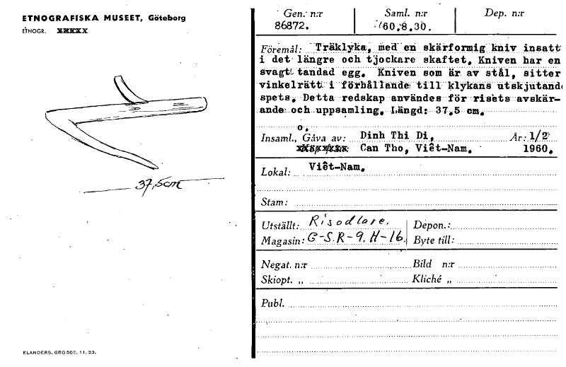 ETNOGRAFISKA MUSEET, Göteborg ETNOGR =X ELANDERS. G13G 502. 11. 53. • Gen: n:r 86872. Saml. n:r I --:/60:8,36. Dep. n:r Föremål: Träklyka, med en Skärformig:kniv insats i det längre och tjockare skaftet, Kniven har ex svagt, tandad egg, Kniven som är av stål, sitter vinkelrät'Li förhållande till- klykans utskjutani nets, Detta .redskap-användes-för-rishts-avskär .andeoch_uppsamling,-Längdx-37,5-cM. o. Insand, Gåva av: Dinh Thi Di, Ar: 1/2, xX8F15~ Can Tho, Vi8t-Nam. • 1960, Lokal: Viet-Nam, Stam: io r la Utställt: I\ ' 1 ° 61# r e ' Depon.: Magasin: G -S • R- 9, il- /6. Byte till: Negat. n:r Bild n:r Skiopt. „ Kliché „ • Publ. [ocr]