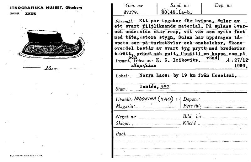 • ETNOGRAFISKA MUSEET, Göteborg UNOGIC XVOPX 23c,r, ELANDER5. GBG 502. 11. 53. -Gen. n:r 87079. Saml. n:r 1 '66;45..labi Dep. n:r Föremål: Ett. par tygskor för kvinna, Sulor av ett evartfiltliknande.... Visa hela