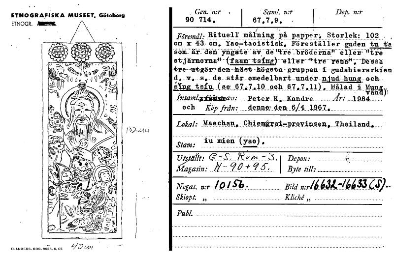 ETNOGRAFISKA MUSEET, Göteborg ETNOGR. *IM k-0Y trw erfil g,e,..t tir. ' ..4 da, .egilfr Gen. n:r • Saml. n:r Dep. n:r 90 714. 67.7.9. • Föremål: Rituell målning på papper; Storlek: 102 , cm x. 43, cm„ Yao—taoistisk. Föreställer guden tu ta som.. ar. den yngste av, de ntre .bröde rna" eller- 'tre stjärnornaP.(faam ising) eller ntr ren' • Dessa •tre utgör- den•häst högsta gruppen i gu.dahierarkien d, v „ a. de står omedelbart under rt,-jud hung. och sing tsfu. (se 67.7,10 och 67.7,11). Målad it Muniff 196v4ana)' hisaml.xfizicarav: Peter K. Kandre och Köp från: denne- den 6/4 1967 Lokal: Maechan, Chiergrai—provinsen„ Thailand. Stam: ju mien (yao). Uts it: kvm —3.1 Depon: Magasin:Magasin:....1"-- 0 + 6-, I Byte till: Negat. n:r /0 •S'I • Bild n:4634463 CJ2. Skiopt. „ Kliché,, Publ. ELANDERS. GRO. 8626. 6. 65 ,) 64, i [ocr]