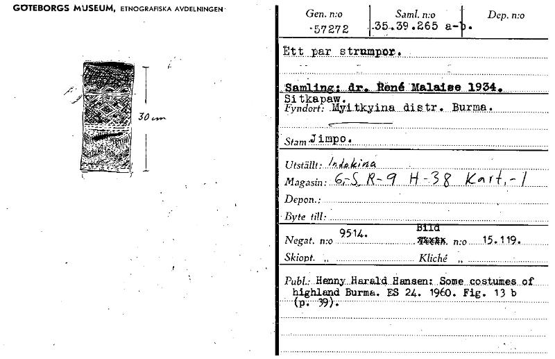 • GOTEBORGS MUSEUM, ETNOGRAFISKA AVDELNINGEN Gen. n:o Samt. n:o .57272 —35-.39 .265 a•-• . Dep. n:o tt par strumpor. Samling: dr. Itäntå -Malaise 1934. Sitkapaw. Fyndort: .Myttk..y.ina di tr • Burna. ... Visa hela
