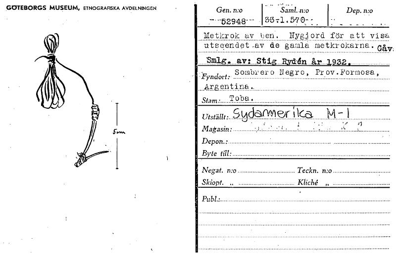 GOTEBORGS MUSEUM, ETNOGRAFISKA AVDELNINGEN Gen. n:o Saml. ,n:o -52948- - 5071.5-70- - Dep. n:p Ubtkrok av ben'. Nygjord för att visa utseendet-av de gamla metkrokarna.uv Sm1g. av: StIg....13,,vd.dn..år...1,9.32. Sombrero Negro, Pr9v.Formosa, •-Fyndort:. Argentina. Stam • Toba. tAdadvn i k.a. - i ' • ' i Negat. n:o Teckn. n:o Skiopt. „ KlicU „ Utställt: Magasin • Depon.: Byte till: Publ • [ocr]