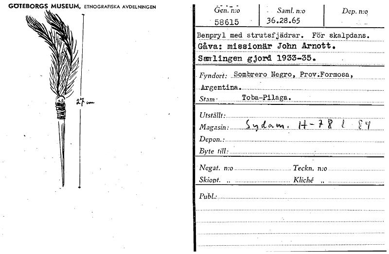 • GOTEBORGS MUSEUM, ETNOGRAFISKA AVDELNINGEN 6-e n. ....tjo 58615 - Saml. n:o 36.28.65 Dep. n:o Benpryl med strutsfjädrar. För skalpdans. Gåva: missionär John Arnott. Sanlingen gjord 1933-35. Fyndort: ... Visa hela