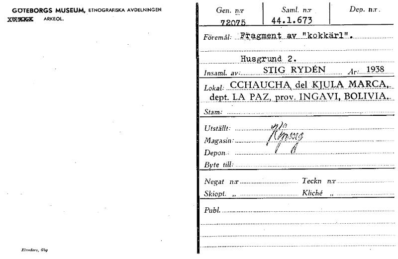 GOTEBORGS MUSEUM, ETNOGRAFISKA AVDELNINGEN XIMMIC ARKEOL. Elanders, Gbg Getz. n:r 72075 Sam!. n:r . 44.1.673 Dep. n:r. Föremål: F9,..gment av "kokkärl!' . Husgrund 2. 1 Insaml. av: STIG RYDIN År: 1938 Lokal: CCHAUCHA, del ,KJULA MARCA,_ dept. LA PAZ, prov. INGAVI, BOLIVIA._ Stam: . Utställt: Magasin: . Depon.: Byte till: m9)4 /9714W if Ålegat n:r Skiopt. „ Teckn n:r Kliché „ PubL [ocr]