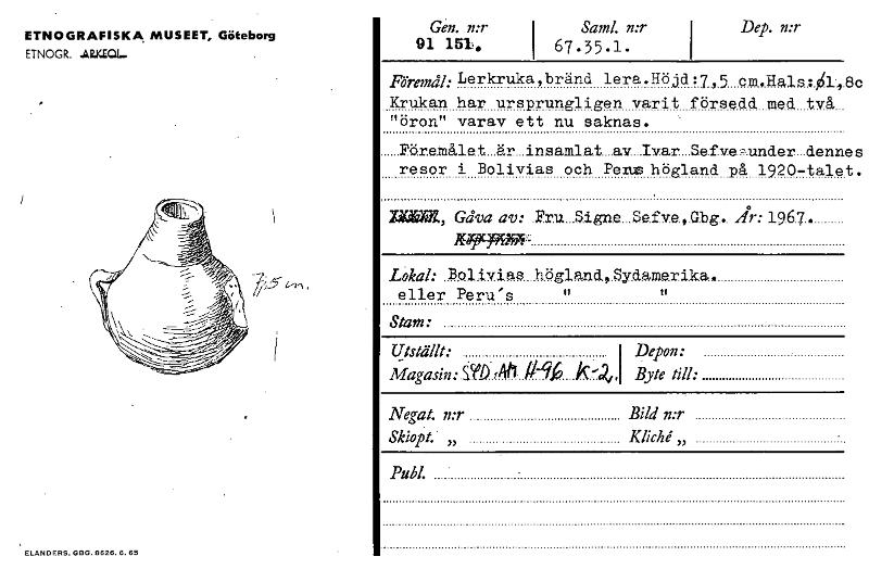 Dep. n:r ETNOGRAFISKA MUSEET, Göteborg ETNOGR. Gen. mr I Saml. n:r 91 151. 67.35.1. Föremål: Lerkrukaybränd lera. Hö jd :7,5 cm,11als:Ig1 8c Krukan har ursprungligen varit försedd med två "öron" varav ett nu saknas. Föremålet är insamlat av Ivar Sefve-under dennes resor i Bolivias och Pengs högland på 1920-talet. TJIM, Gåva av: Fru Signe Sefve Gbg. 1967. /09519999f - Lokal: Boliviae högland,Sydamerika. eller Peru's It 11 Stam: Utställt: I Depon: Magasin: S?D Byte till: Negat. n:r Bild n:r Skiopt. „ Klicht; „ Publ. ELANDERS. GBG. 6626. 6. 65 [ocr]Stäng