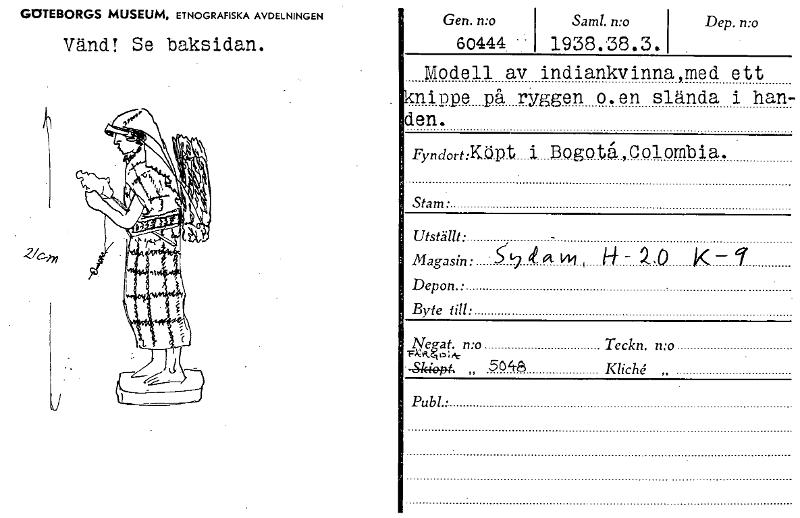 Gen. n:o Saml. n:o Dep. n:o 60444. 1938.38.3. Modell av indiankvinna,med ett nippe på ryggen o.en slända i han- den. Fyndort :Köpt i Bogotå,Colombia. Stam • Utställt: Magasin: tt a vm 2.0 K- 7 Depon...