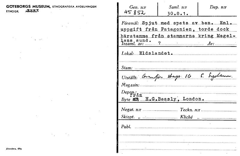 • GOTEBORGS MUSEUM, ETNOGRAFISKA AVDELNINGEN ETNOGR. AWLX Gen. n:r 45- g 52,d Samt n:r 30.8.1. Dep. n:r Föremål...Spjut med spets av ben. E.nr. uppgift från Patagonien, torde dock härstamma från $.ta... Visa hela