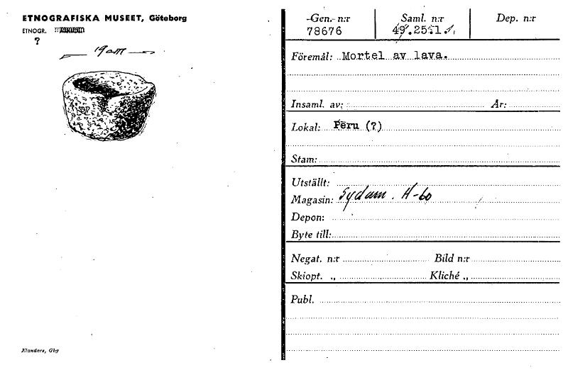 • ETNOGRAFISKA MUSEET, Göteborg ETNOGR. ratRaZE1 n:r Saml. n:r 78676 Dep. n:r Föremål: Mortel av lava. Insaml. av: r' Är: Lokal: Peru (7) Stam: Utställt: Magasin: Depon: Byte till: Negat. n:r Bild n... Visa hela